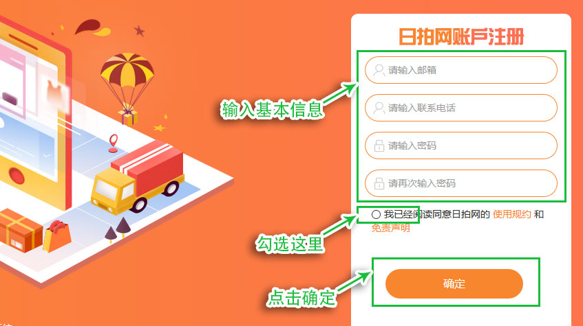 打开会员注册页面,按要求填写相关信息,勾选“我已经阅读并同意日拍网的 使用规约 和 免责申明”